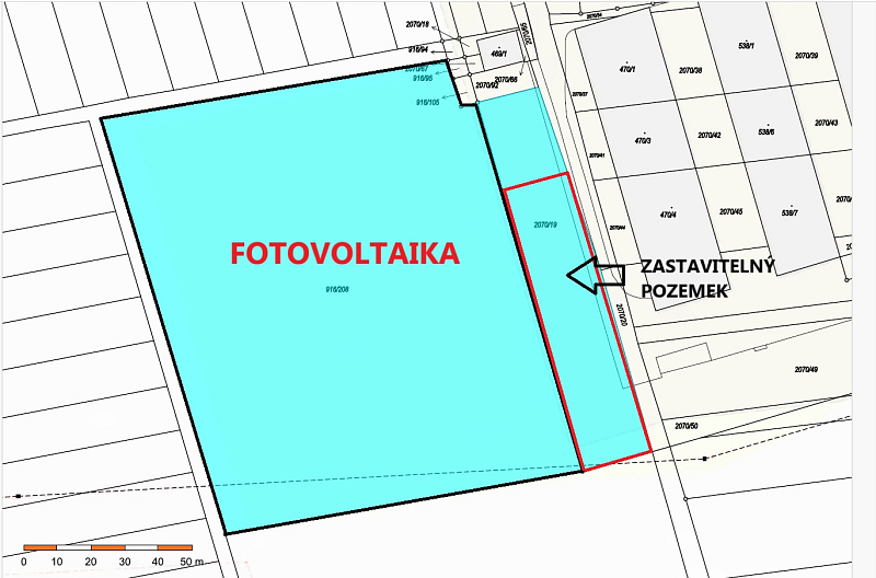 Na základě uzemního plánu je část pozemku cca 1500 m2 zařazena v zóně, která umožňuje výstavbu průmyslové haly ke komerčnímu využití. Druhá část pozemku je ÚP zařazena do zóny, kde se počítá s fotovoltaickou elektrárnou.